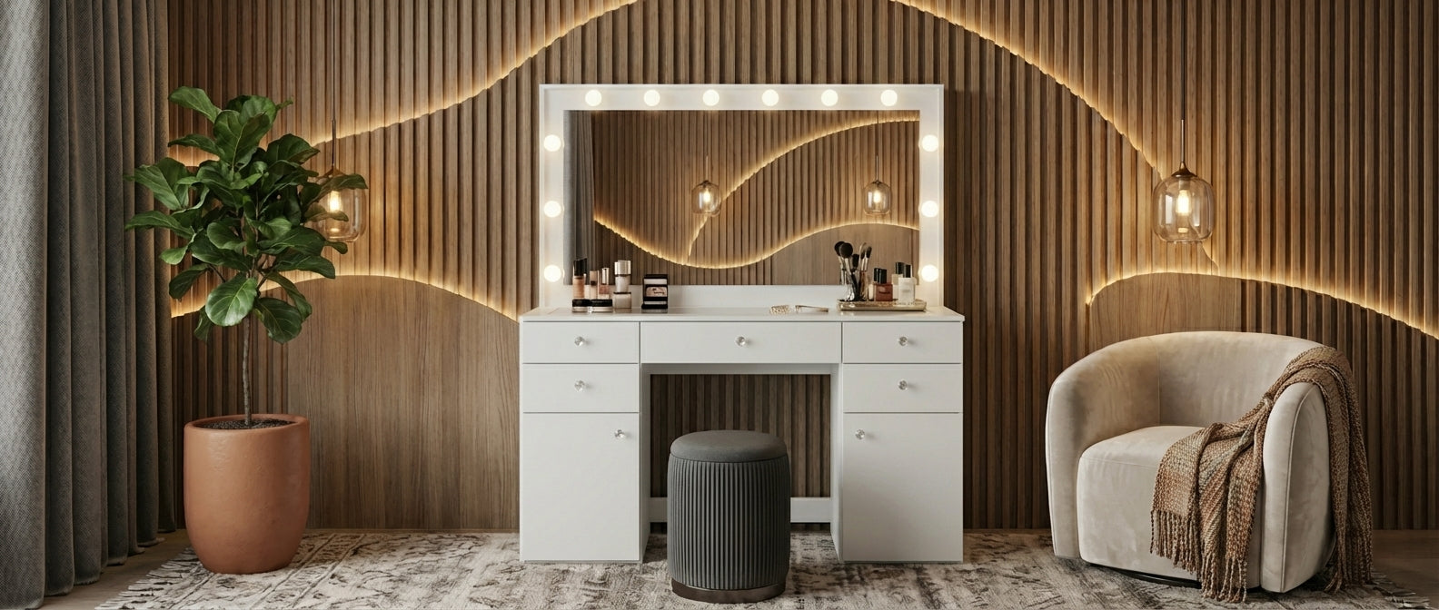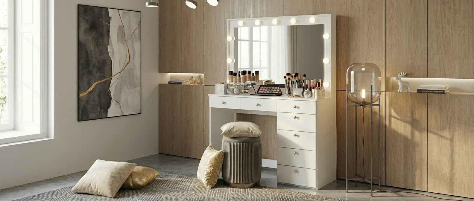 Create your perfect prep spot: crisp lines, practical compartments, and a glow that makes every look feel special. Assemble in no time, love it for a long time.
